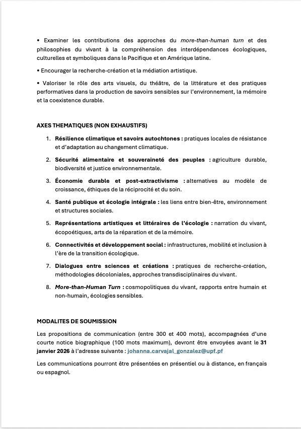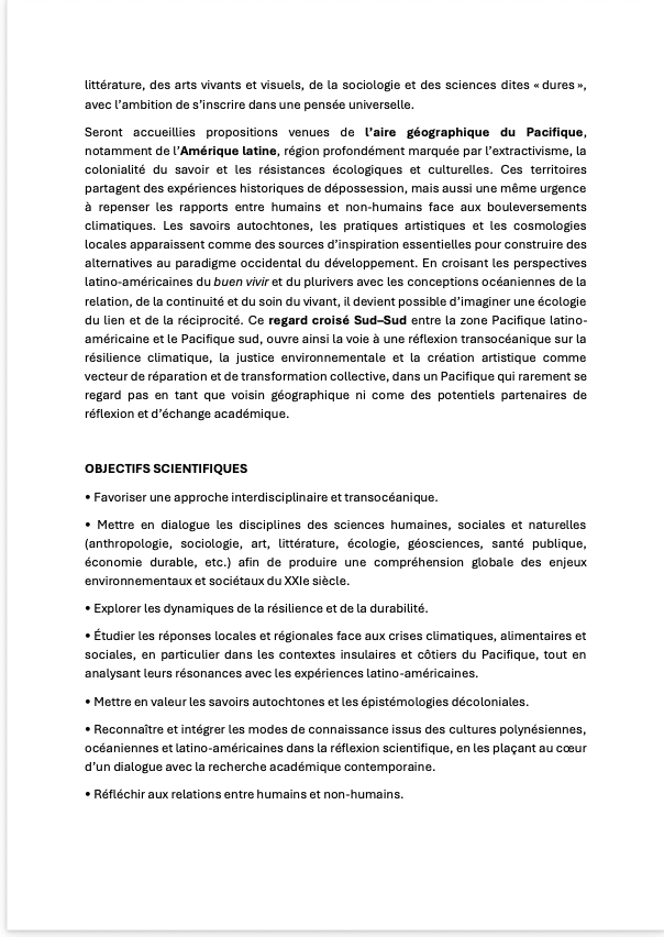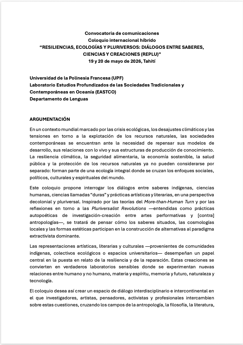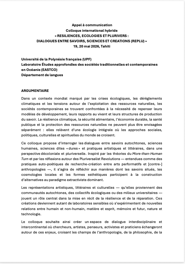 Nous sommes heureux de partager cet appel à communication émanant de l’Université de la Polynésie Française et transmis par M. Najma (PrAg, U. de Polynésie Française, docteur en littérature du Siècle d’Or). Il s’agit d’un colloque transversal autour de l’aire Pacifique et qui propose le format hybride.