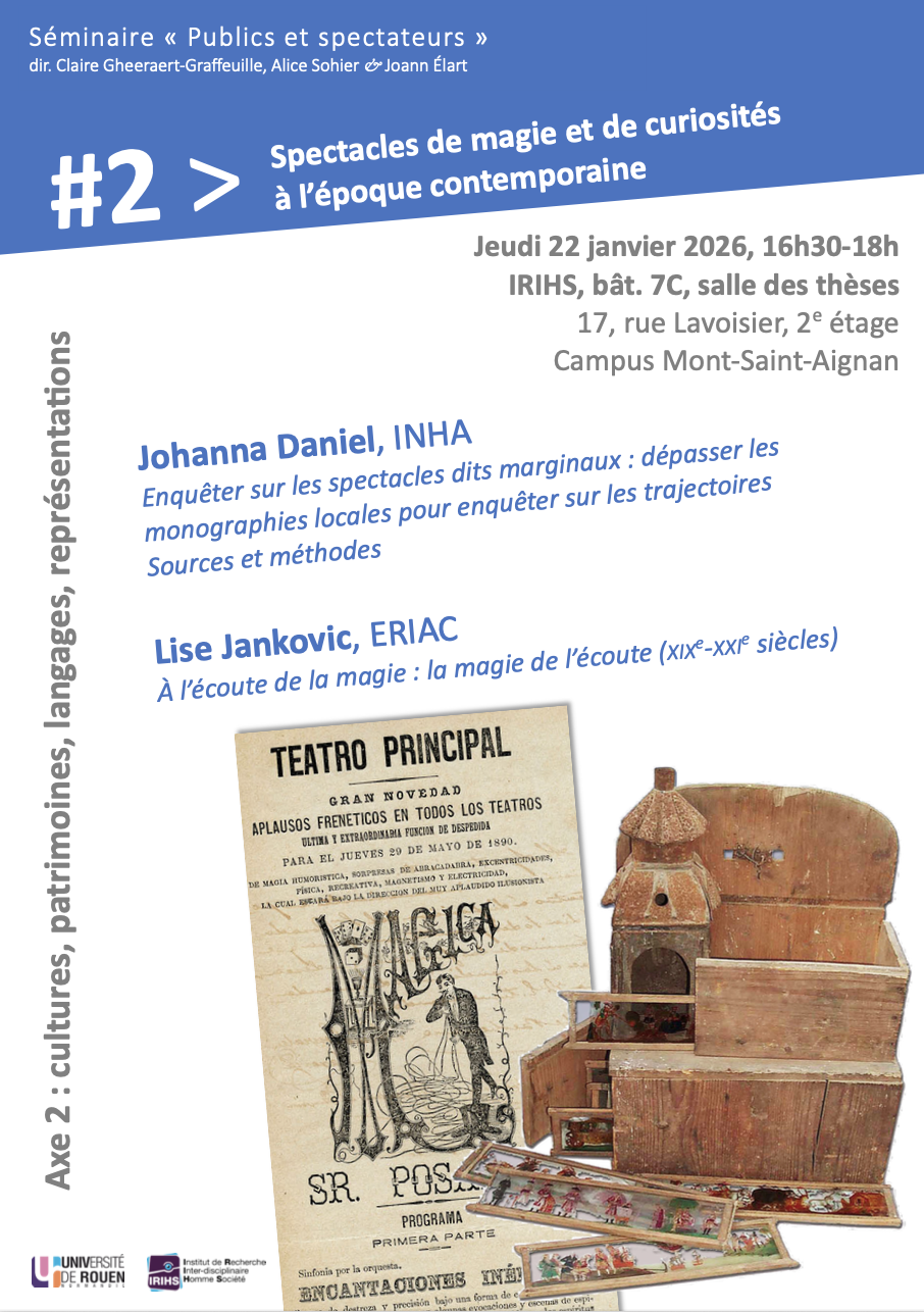 Nous sommes heureux de vous convier à la prochaine séance du séminaire » Publics et spectateurs » qui aura lieu le 22 janvier 2026 et qui sera consacré aux spectacles de magie et de curiosités à l’époque contemporaine.