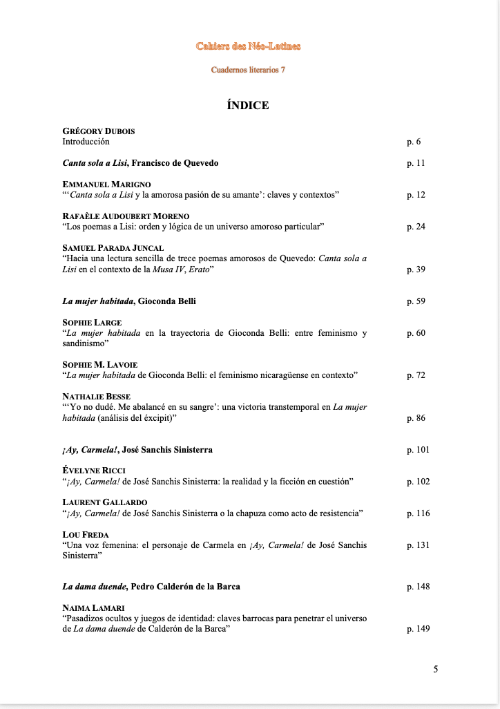 Los programas de las dos Écoles Normales Supérieures para la sesión de 2026 en los que se basan los estudios de este volumen constan de cinco obras: una recopilación de poemas (“Canta sola a Lisi”, extraído de El Parnaso español de Quevedo), dos novelas (La mujer habitada de Gioconda Belli y El entenado de José Saer) así como dos dramas (La dama duende de Calderón de la Barca y ¡Ay, Carmela! de José Sanchis Sinisterra).