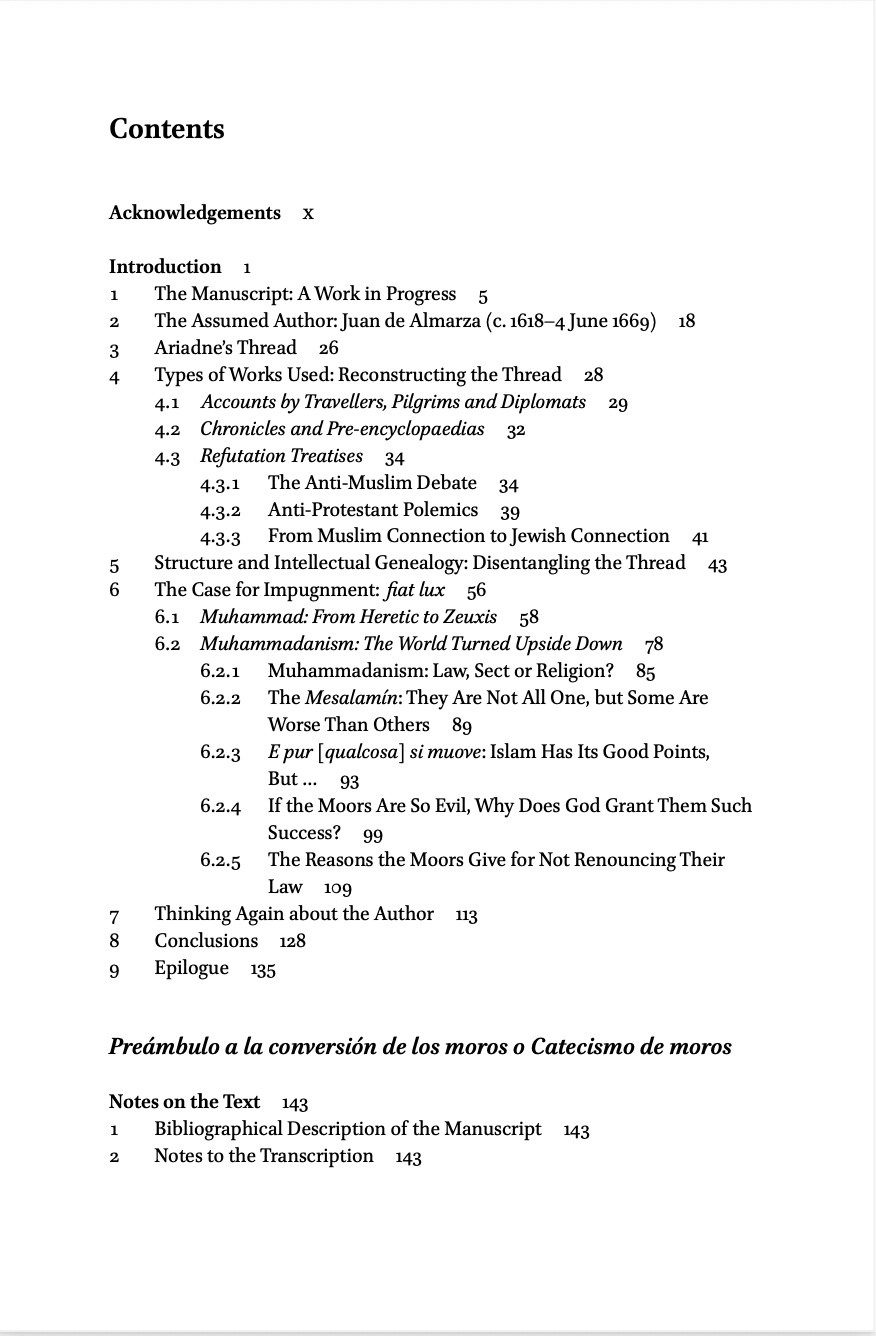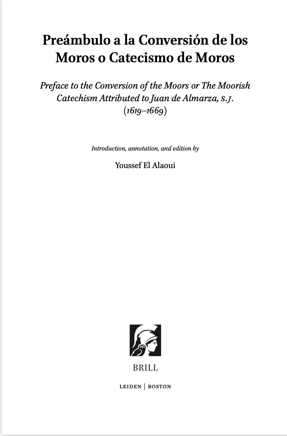 Vous trouverez en pièce jointe la couverture et la table des matières de Preámbulo a la Conversión de los Moros o Catecismo de Moros. Preface to the conversion of the Moors or The Moorish Catechism attributed to Juan de Almarza, S. J. (1619-1669) que vient de faire paraître Youssef El Alaoui chez Brill. La version électronique est d’ores et déjà disponible. Le volume paraître, lui, le 5 mars prochain.