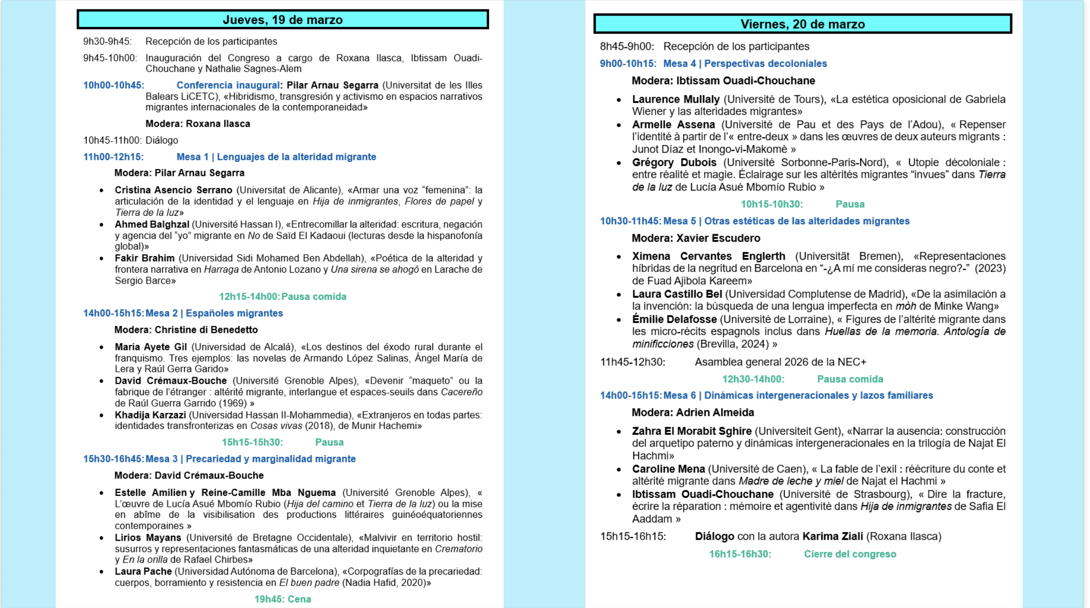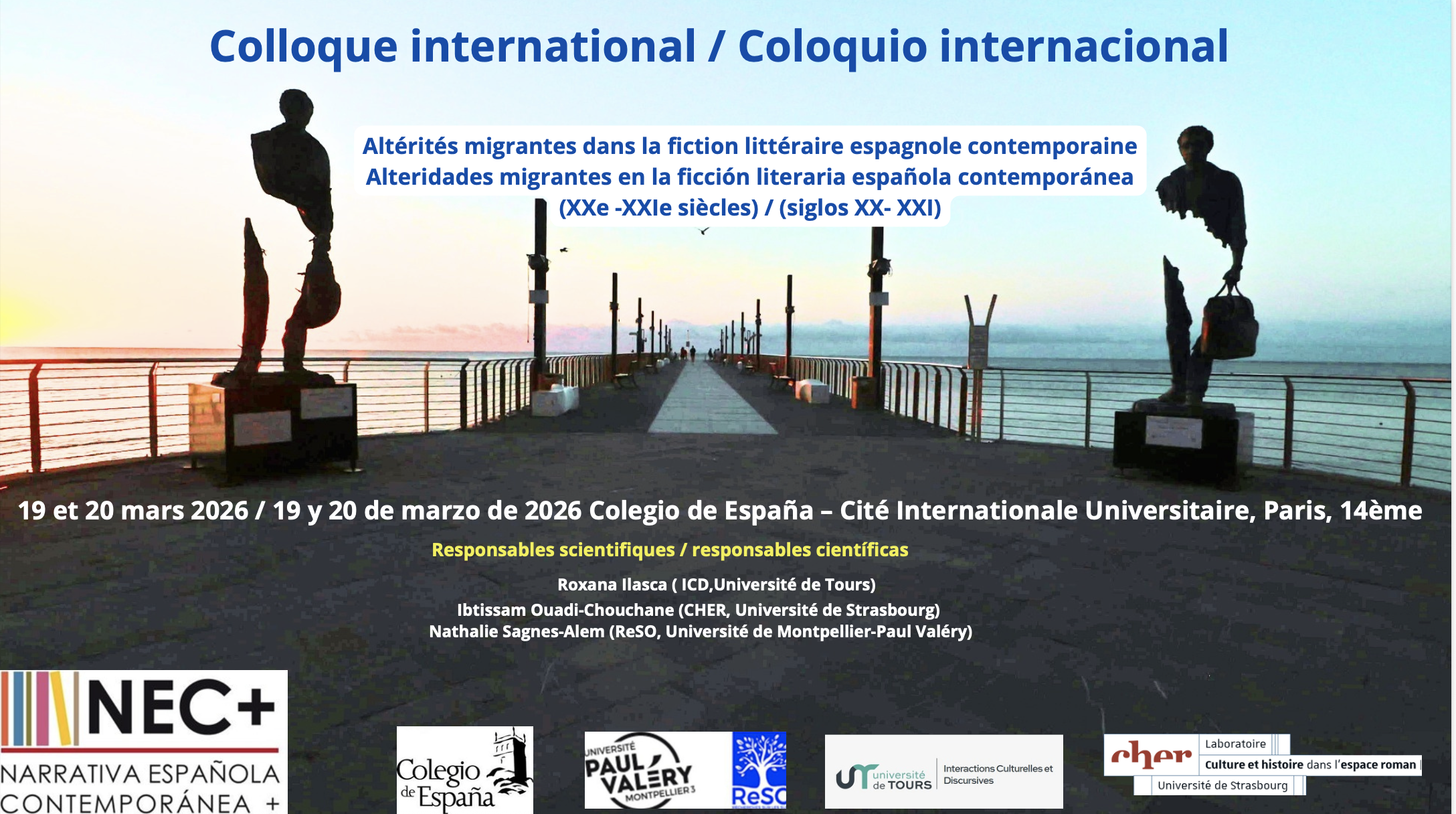 Nous avons le plaisir de vous annoncer le colloque international organisé par la NEC+ : Altérités migrantes dans la fiction littéraire espagnole contemporaine (XXe-XXIe siècles). Alteridades migrantes en la ficción literaria española contemporánea (siglos XX y XXI) – Colegio de España – 19 et 20 mars 2026 –